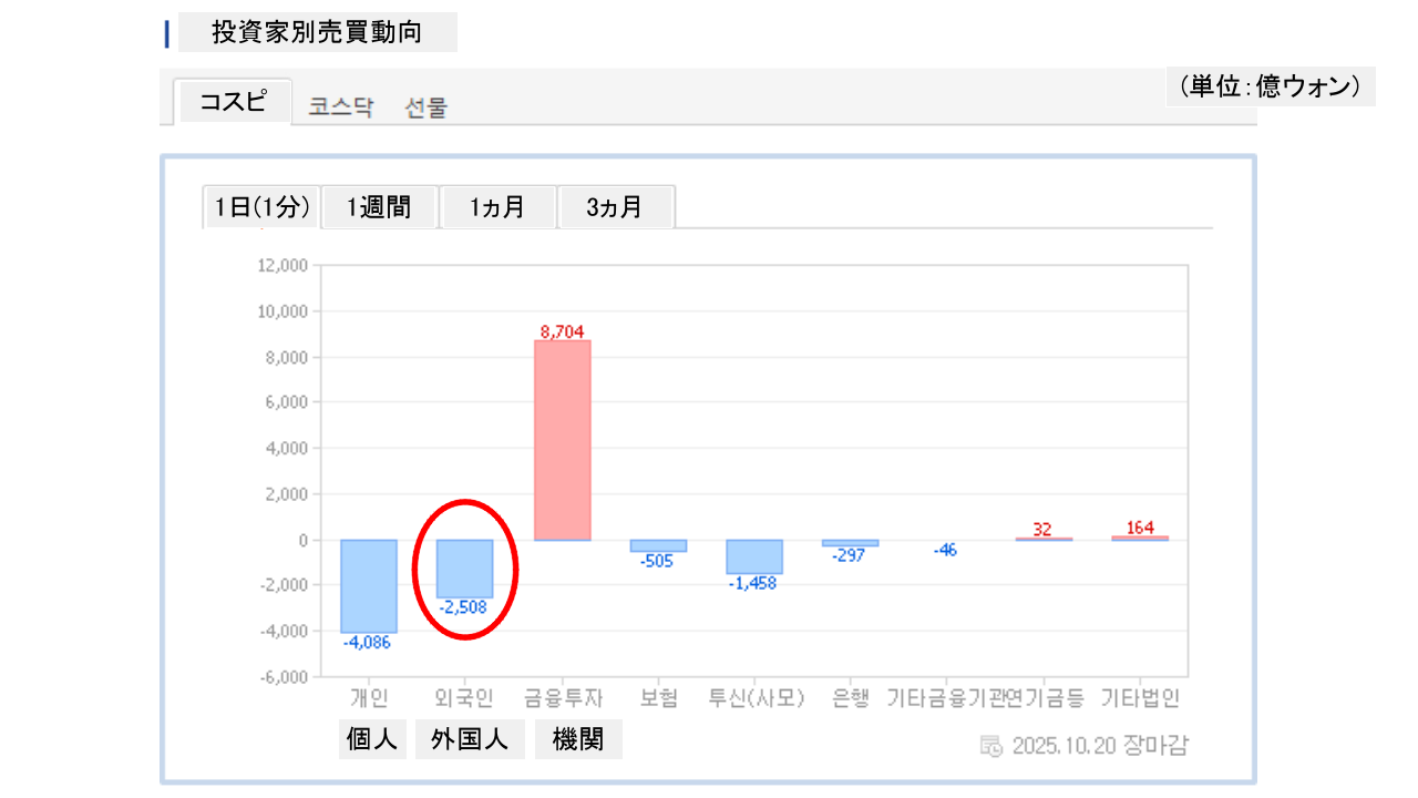 個人投資家は「4,083億ウォン」の売り越し。一方の外国人投資家は「2,509億ウォン」の売り越しです。