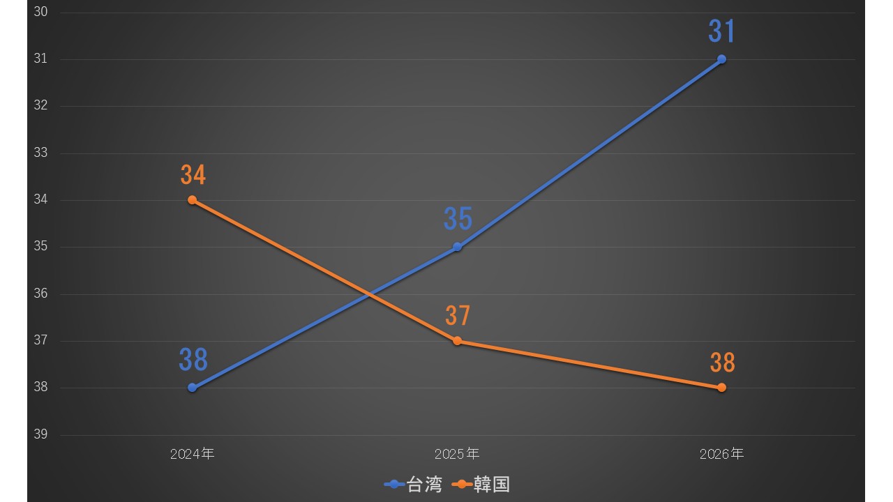 『IMF』が集計した「韓国・台湾 1人当たりGDP順位」予測は以下のように推移します。