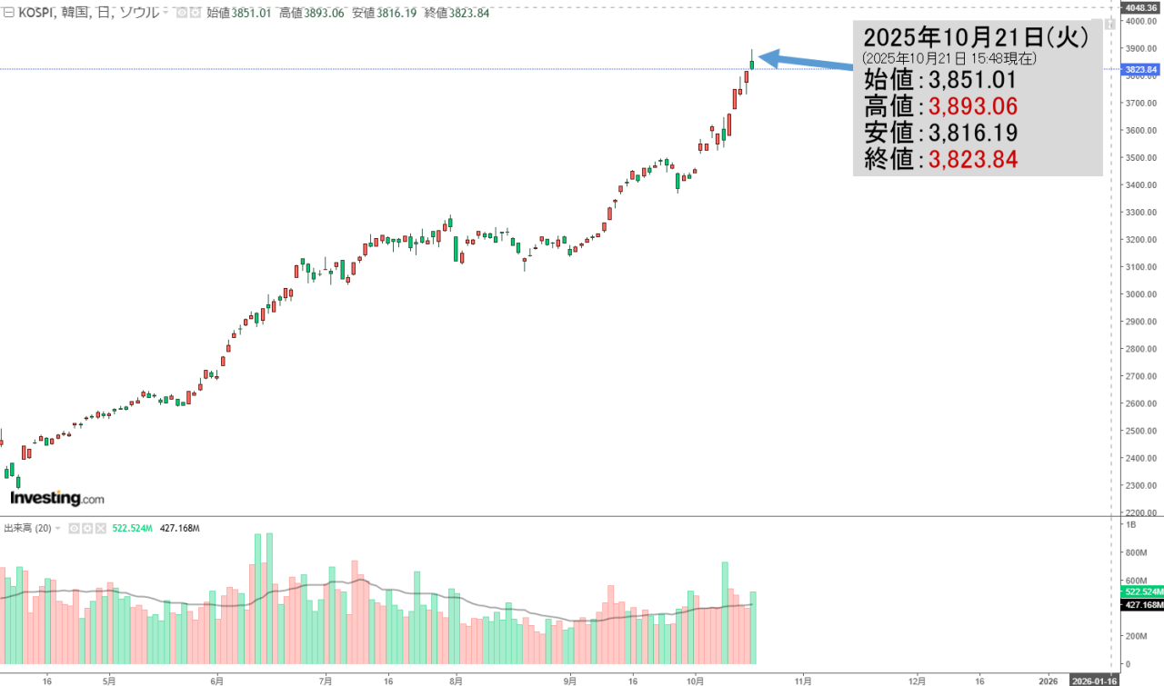 2025年10月21日(火)の韓国株式市場が締まりました。15:48現在、KOSPI(韓国総合株価指数)のチャートは以下のようになっています(チャートは『Investing.com』より引用)。