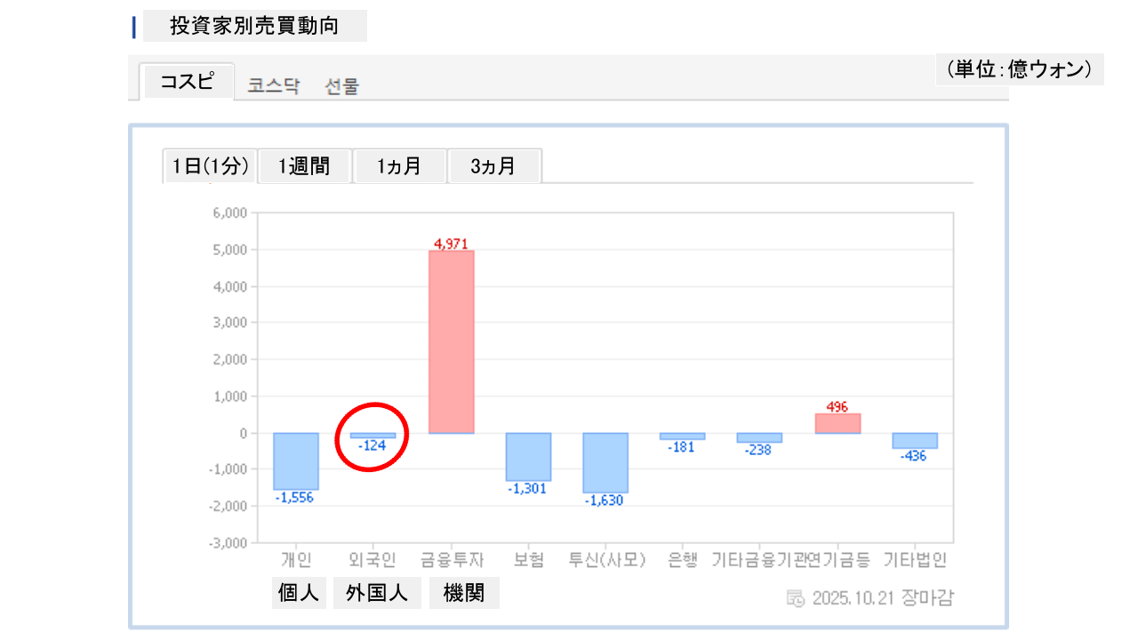 個人投資家は「1,556億ウォン」の売り越し。一方の外国人投資家は「124億ウォン」の売り越しです。
