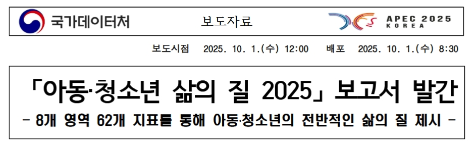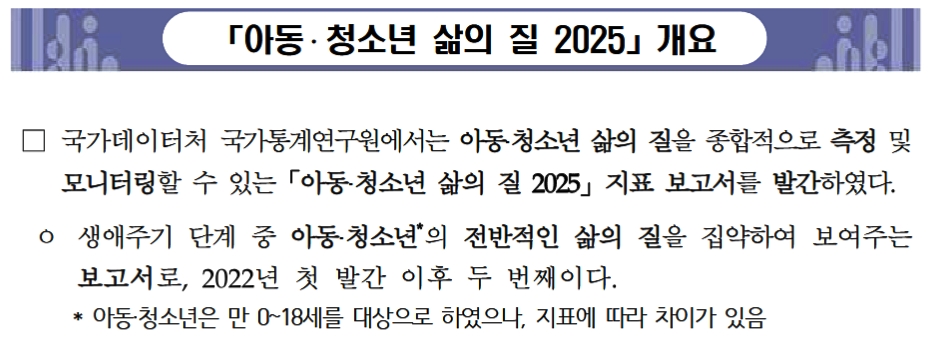 『児童・青少年の生活の質 2025』概要□ 国家データ庁 国家統計研究院では、児童・青少年の生活の質を総合的に測定・モニタリングできる『児童・青少年の生活の質 2025』指標報告書を発刊した。