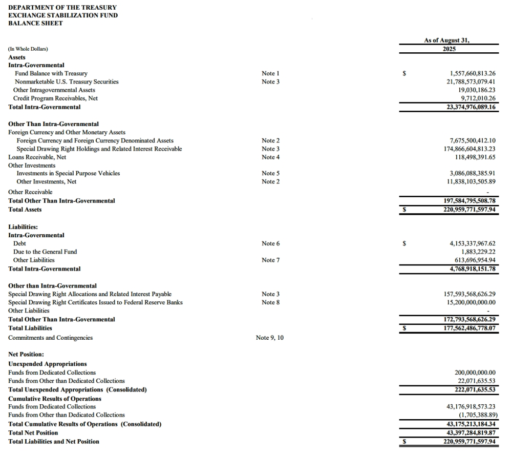 2025年08月末時点で、合衆国財務省が保有するESFの規模は「総資産:約2,209.6億ドル」です(下掲が財務省が公表しているデータ)。