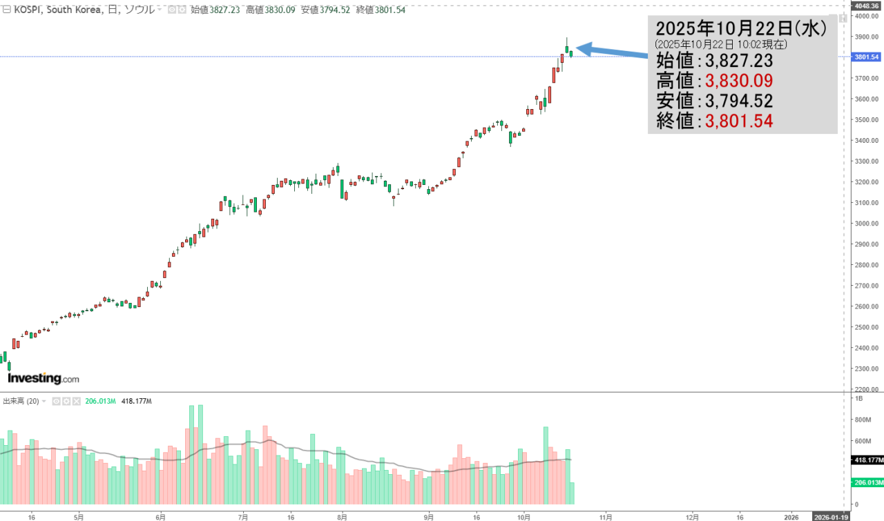 2025年10月22日(水)の韓国株式市場が開きました。10:02現在、KOSPI(韓国総合株価指数)のチャートは以下のようになっています(チャートは『Investing.com』より引用)。