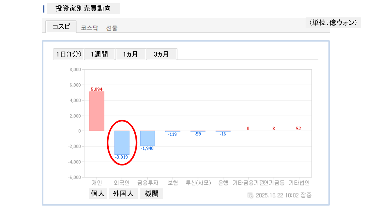 個人投資家は「5,094億ウォン」の買い越し。一方の外国人投資家は「3,019億ウォン」の売り越しです。