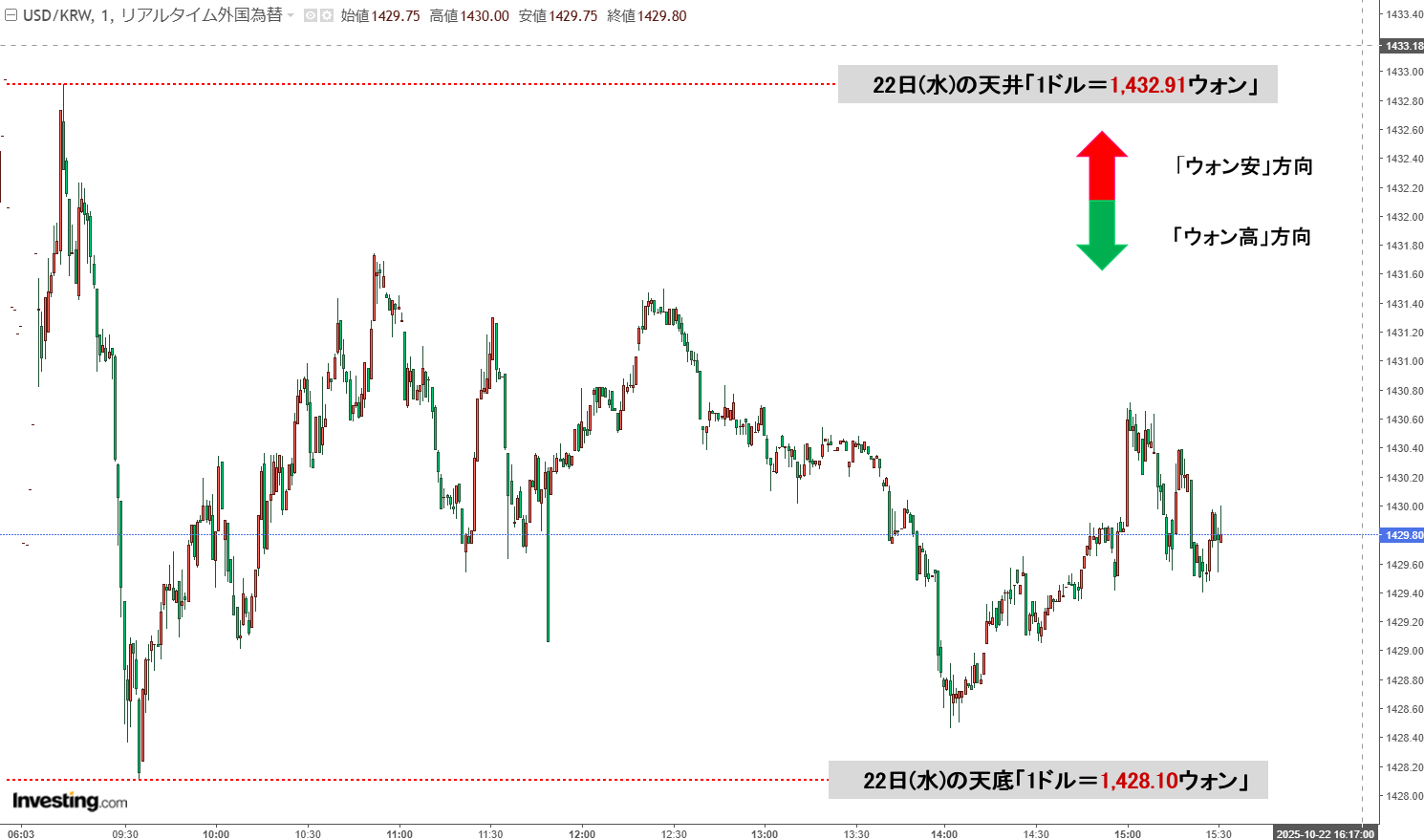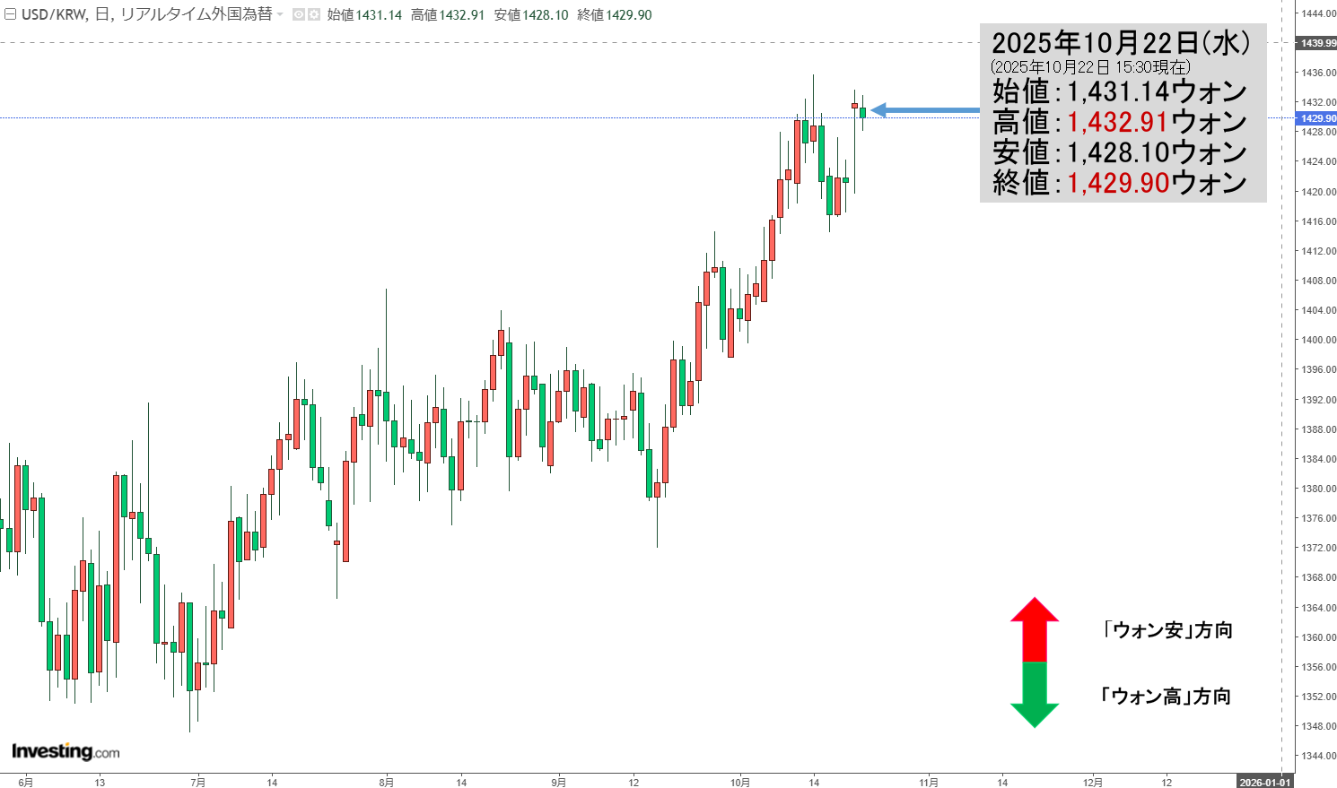 2025年10月23日(木)の市場が開きました。10:00現在、ドルウォンのチャートは以下のようになっています(チャートは『Investing.com』より引用)。これからローソク足の調整が入るかもしれませんが、前日は「1ドル=1,431....