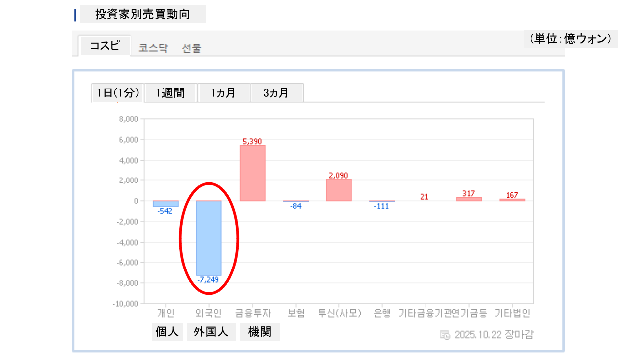個人投資家は「542億ウォン」の売り越し。一方の外国人投資家は「7,249億ウォン」の売り越しです。