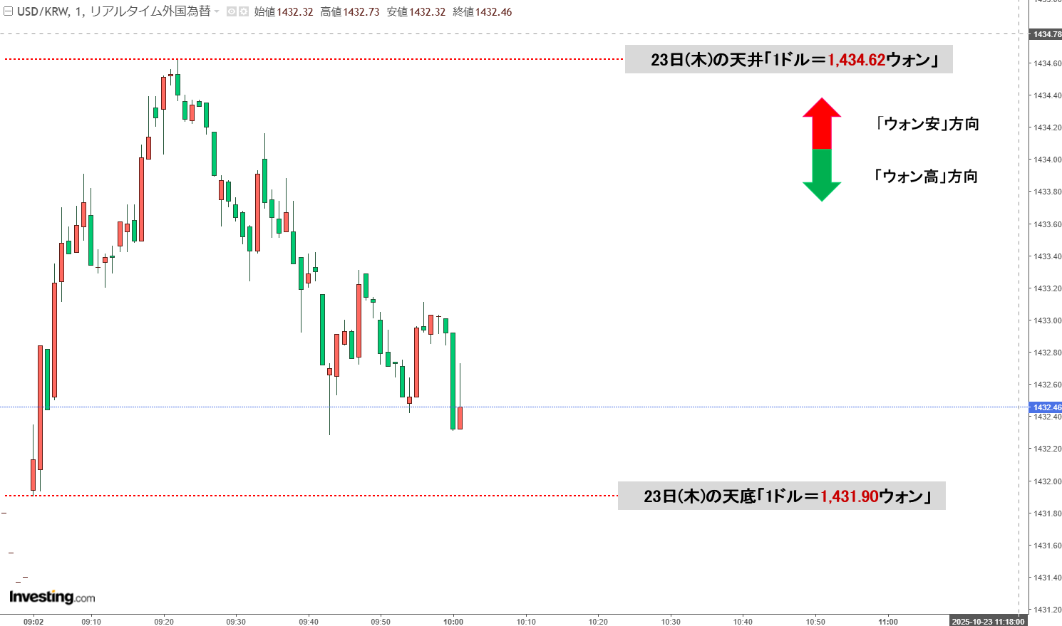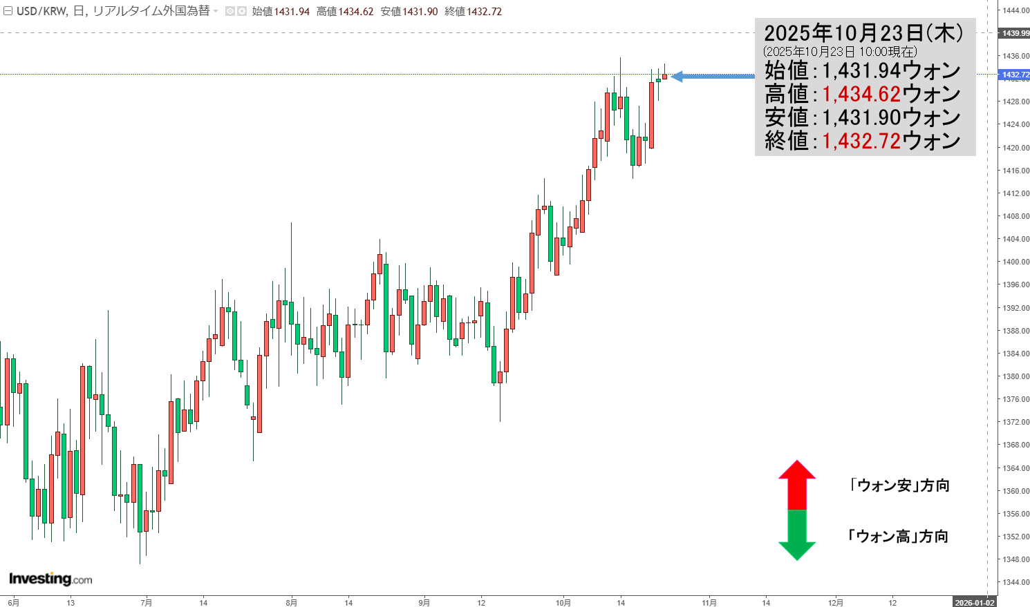 2025年10月23日(木)の市場が開きました。10:00現在、ドルウォンのチャートは以下のようになっています(チャートは『Investing.com』より引用)。