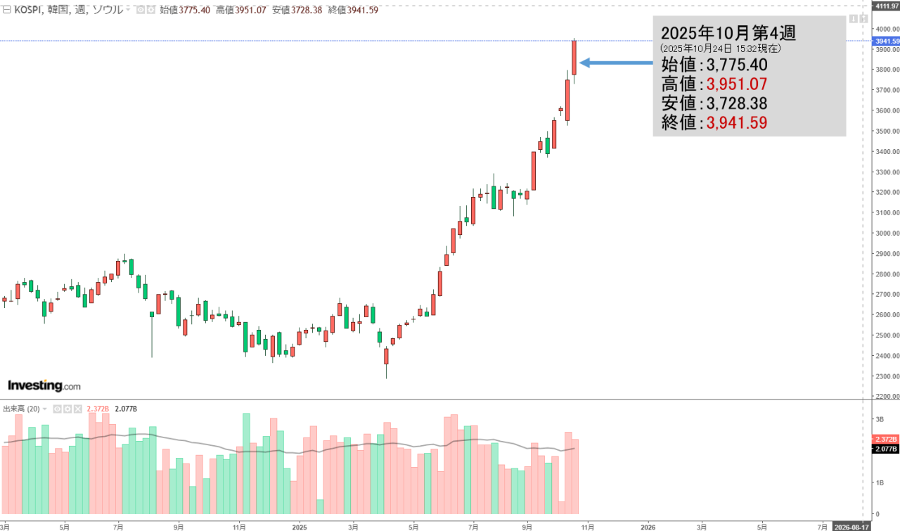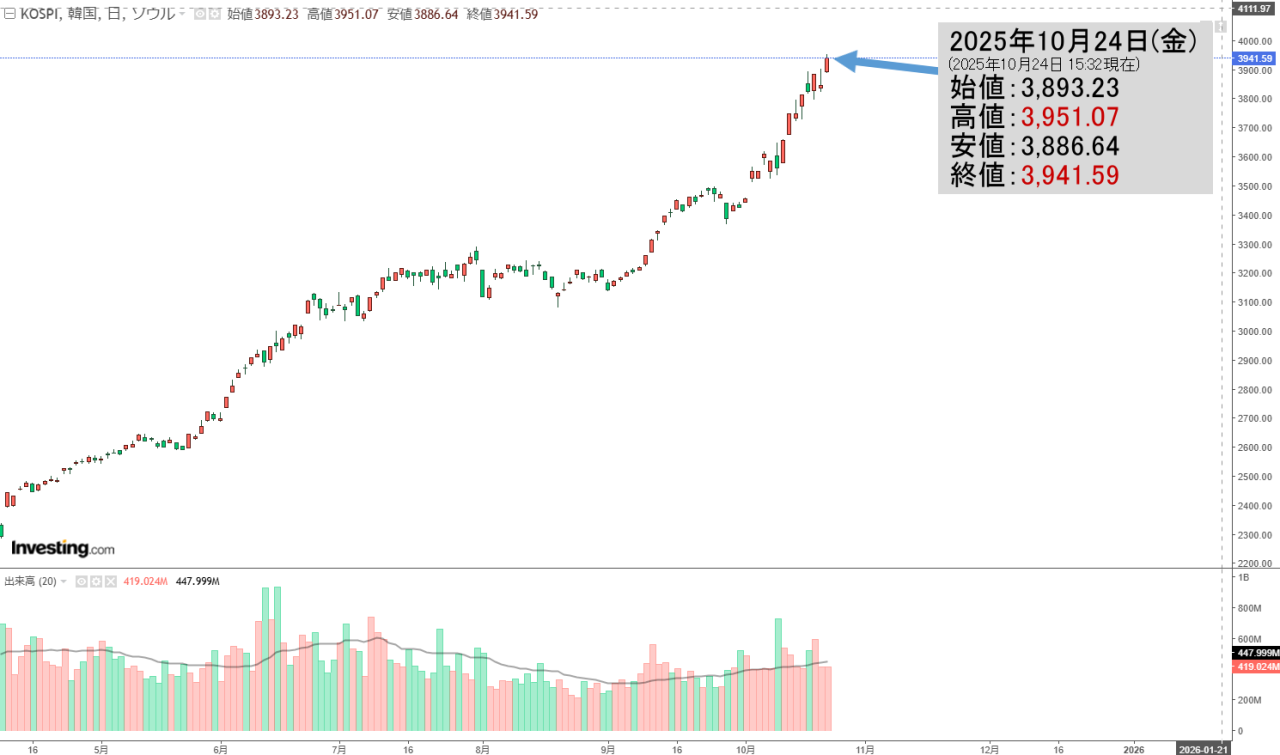 「韓国株式市場」10月27日(月)初動・KOSPI「4,015」ギャップアップ! 4,000突破!