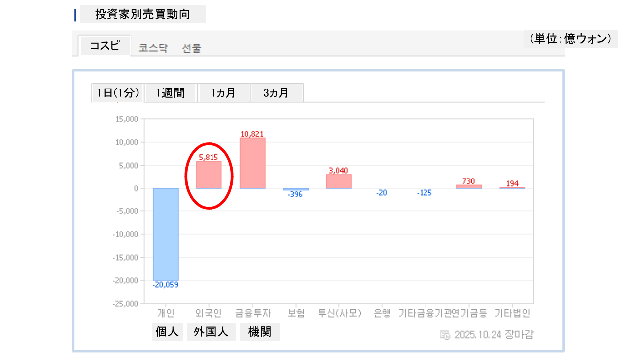 個人投資家は「2兆59億ウォン」の売り越し。一方の外国人投資家は「5,815億ウォン」の買い越しです。