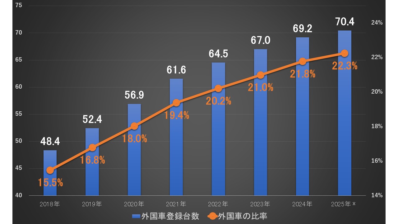 2025年08月時点でソウル市に登録された外国自動車は70.4万台。乗用車だけに限定すれば、全乗用車「277万2,133台」のうち24.9%「69万2,485台」が外国自動車。