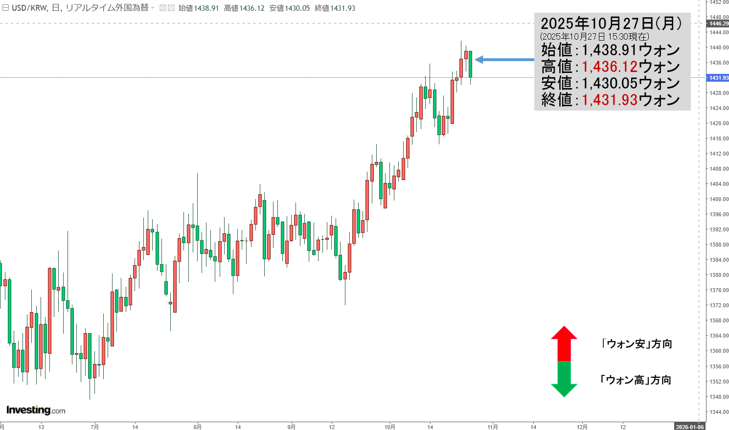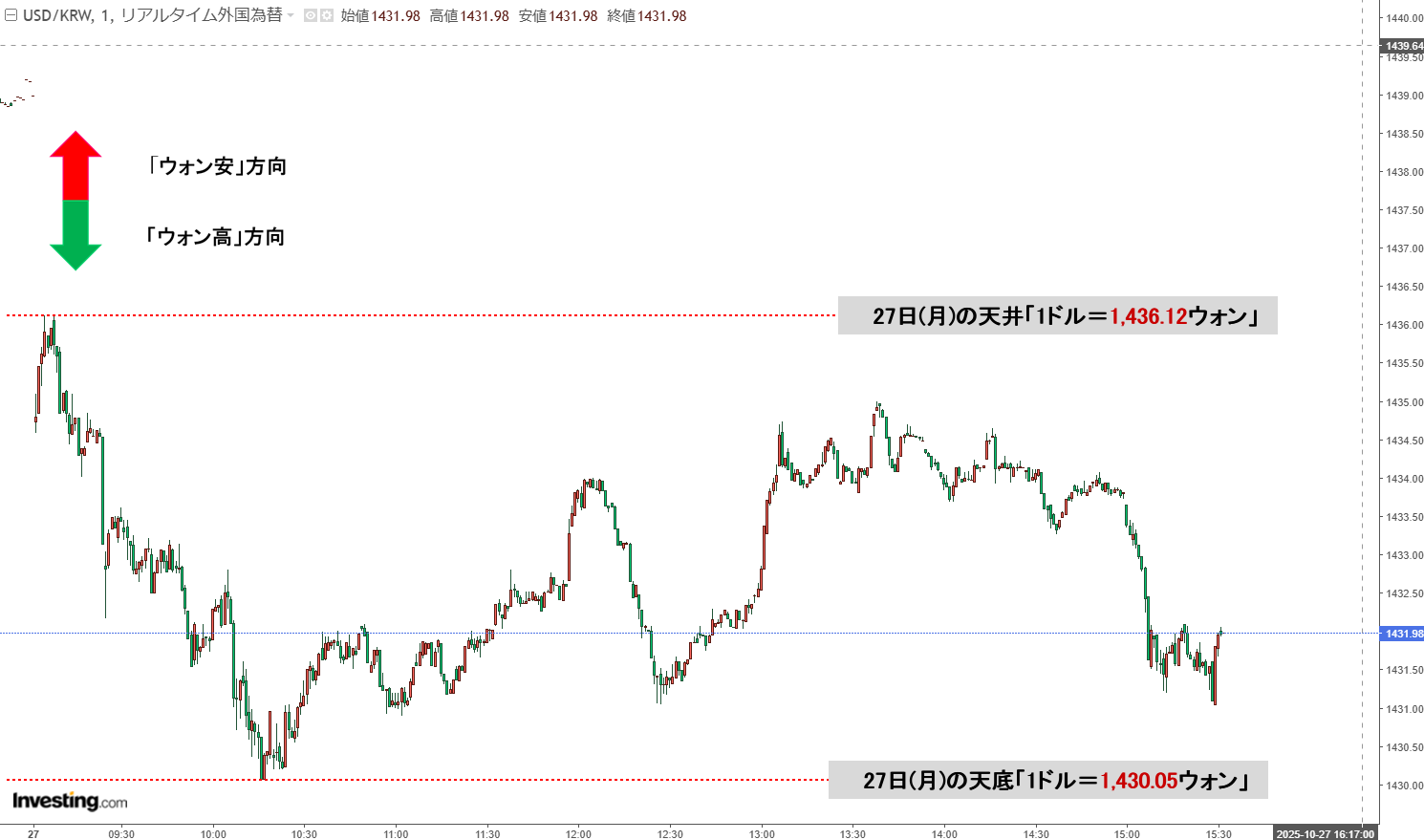 「ドルウォン」10月28日(火)初動・「1,431ウォン」上が重い。