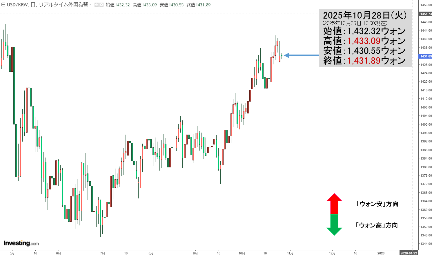 2025年10月28日(火)15:30現在、ドルウォンのチャートは以下のようになっています(チャートは『Investing.com』より引用)。陽線が伸びました。現在のところ「1ドル=1,437ウォン」近辺の攻防となっています。また「1ドル...