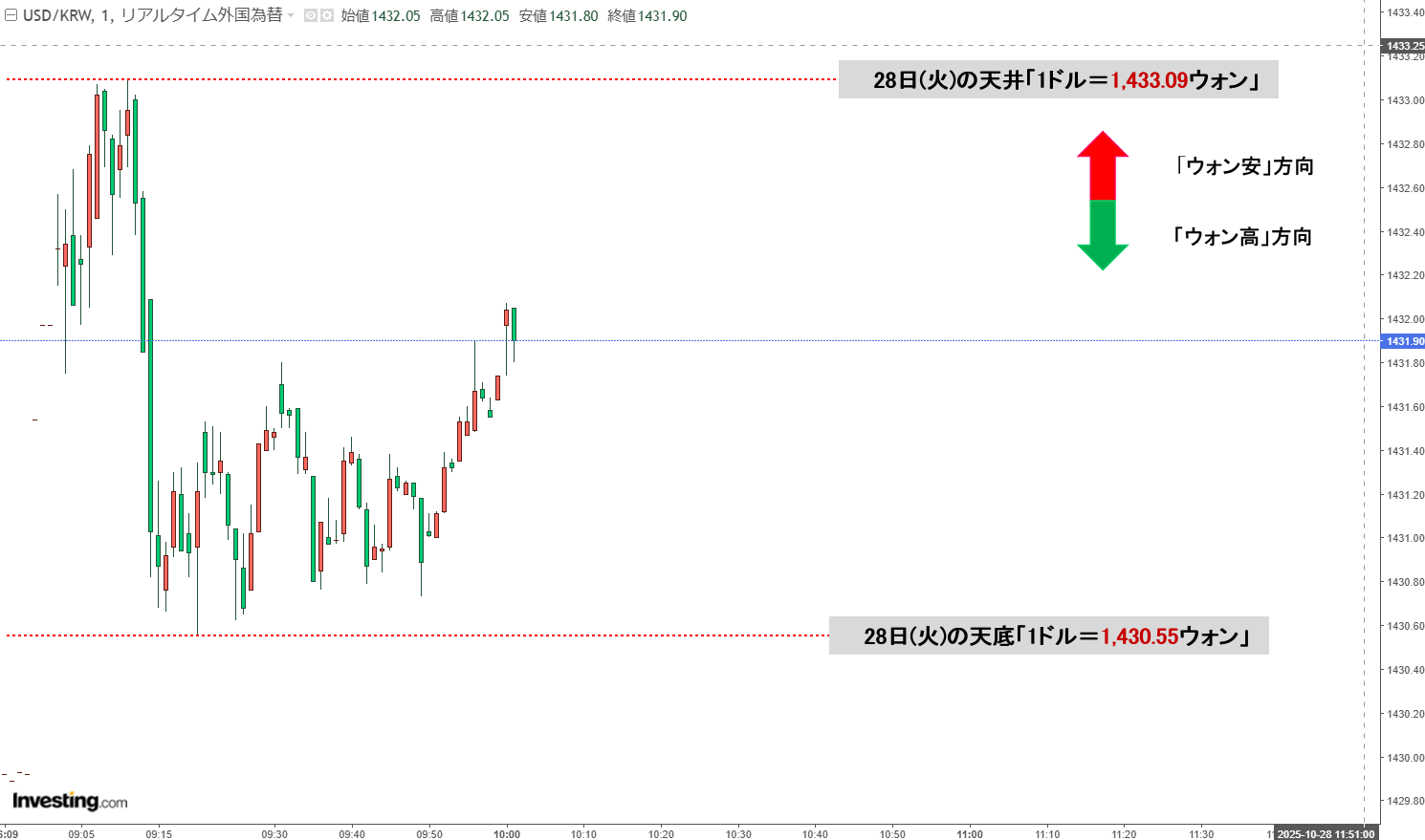 2025年10月28日(火)の市場が開きました。10:00現在、ドルウォンのチャートは以下のようになっています(チャートは『Investing.com』より引用)。