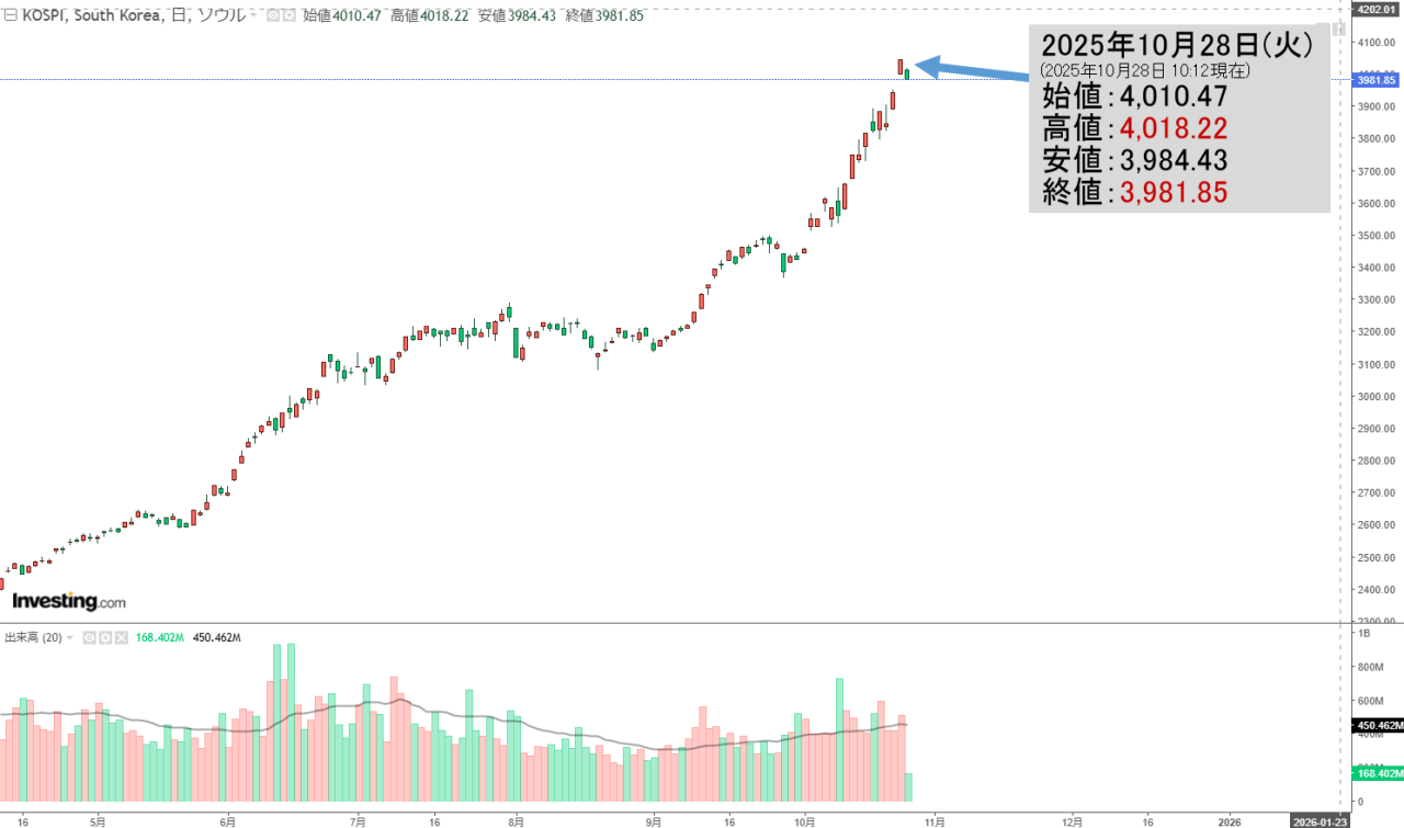 2025年10月28日(火)の韓国株式市場が開きました。10:12現在、KOSPI(韓国総合株価指数)のチャートは以下のようになっています(チャートは『Investing.com』より引用)。