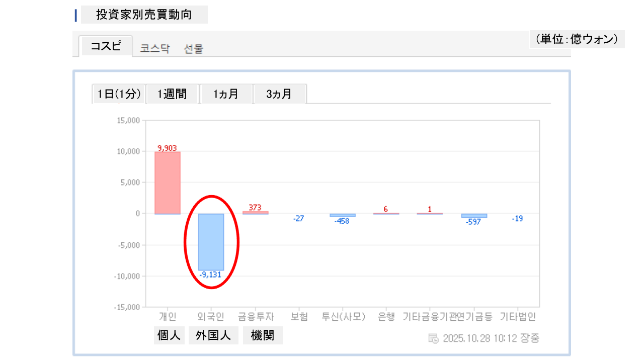 個人投資家は「9,903億ウォン」の買い越し。一方の外国人投資家は「9,131億ウォン」の売り越しです。