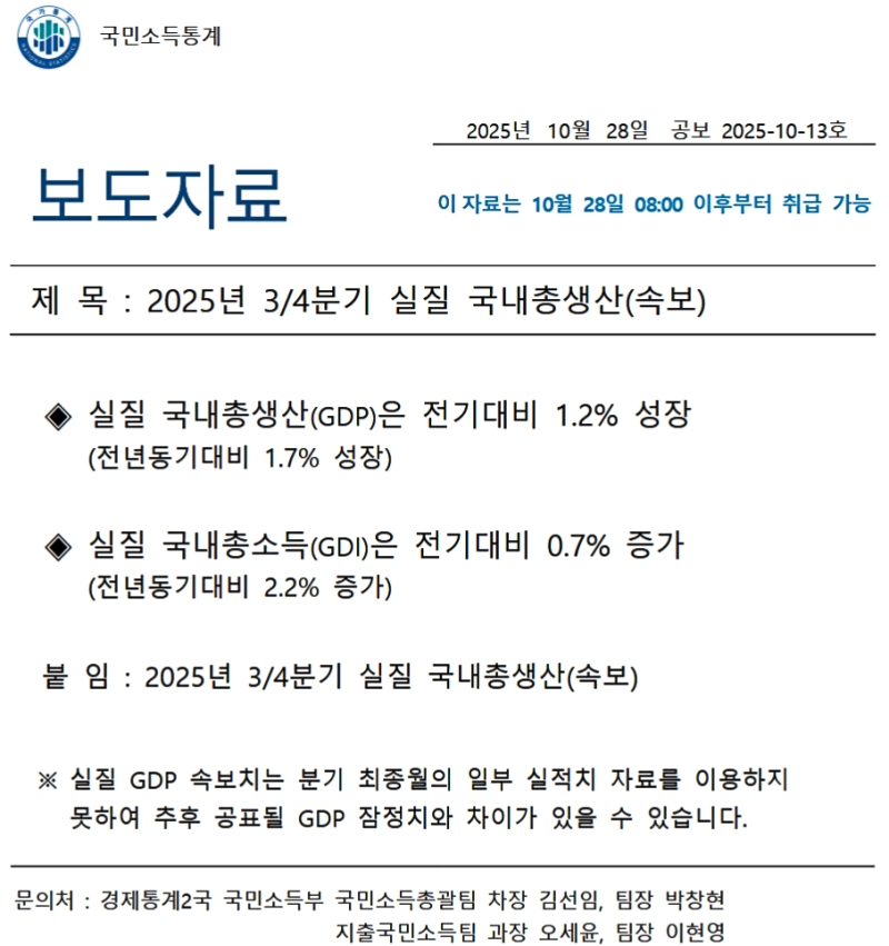 2025年10月28日、『韓国銀行』が「2025年第3四半期の実質GDP成長率」を公表しました。