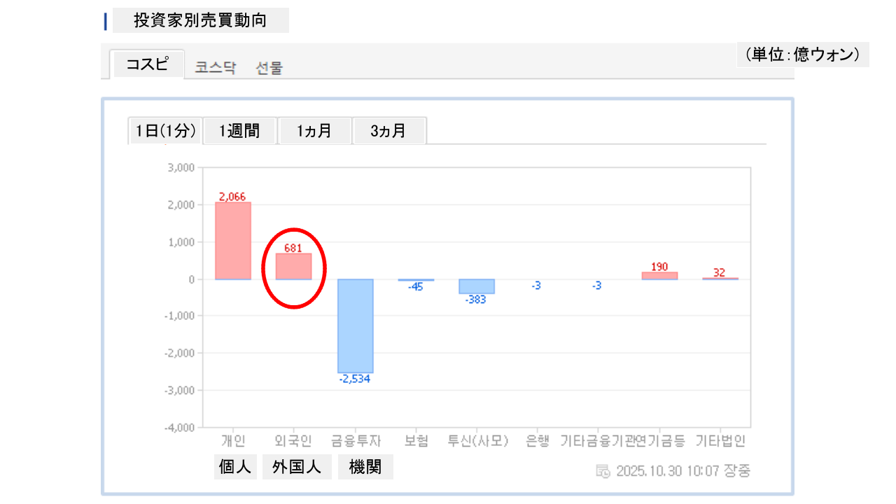 個人投資家は「2066億ウォン」の買い越し。一方の外国人投資家は「681億ウォン」の買い越しです。