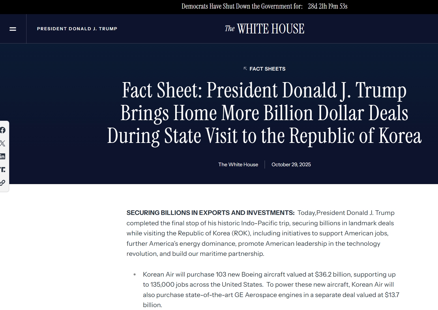 ファクトシート:ドナルド・J・トランプ大統領、韓国国賓訪問でさらに数十億ドル規模の契約を持ち帰る