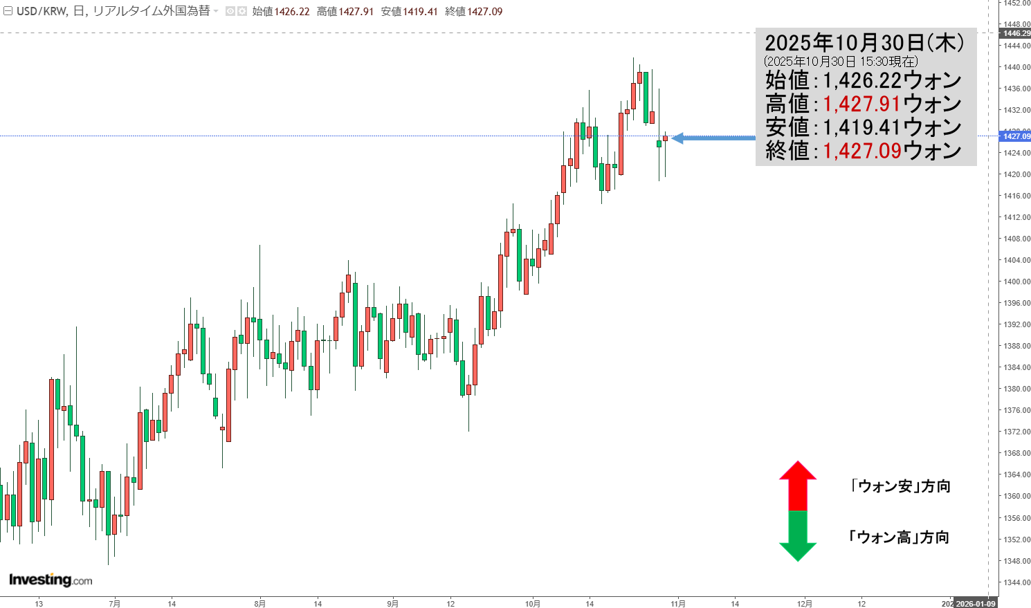 2025年10月31日(金)の市場が開きました。10:00現在、ドルウォンのチャートは以下のようになっています(チャートは『Investing.com』より引用)。これからローソク足の調整が入るかもしれませんが、現在のところ「1ドル=1,4...
