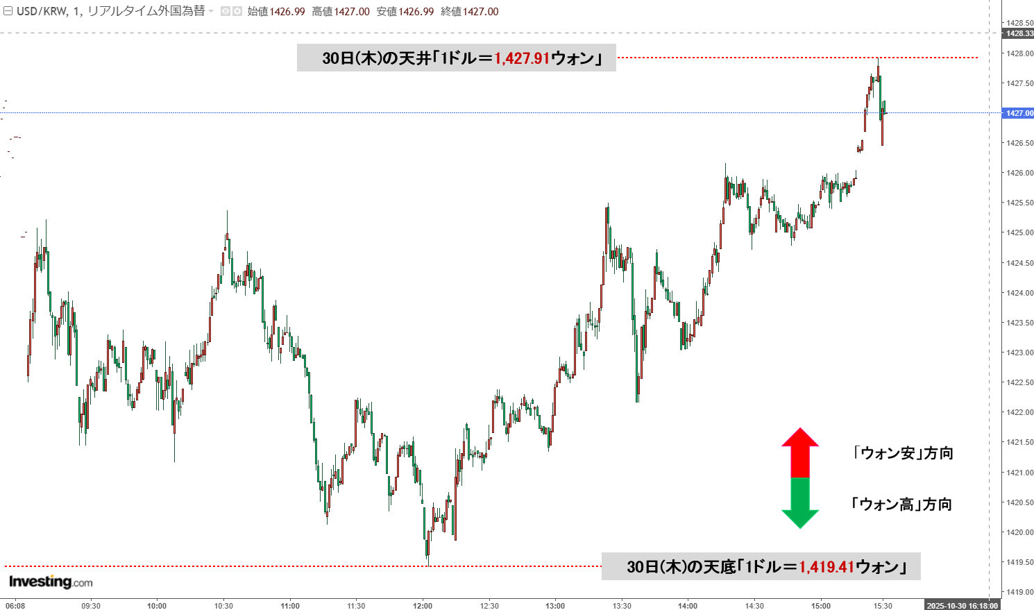 「ドルウォン」10月31日(金)初動・「1,428ウォン」上げ始まりで陰線。