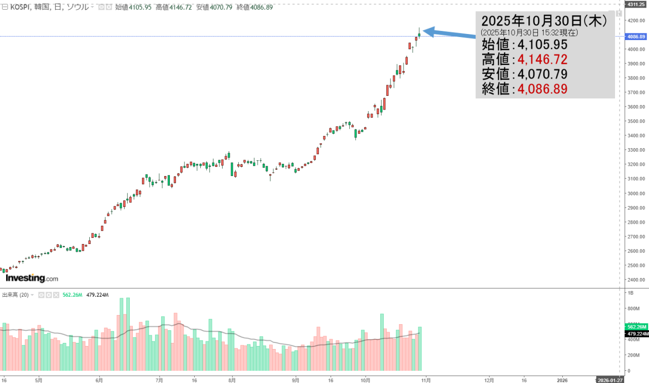 2025年10月30日(木)の韓国株式市場が締まりました。15:32現在、KOSPI(韓国総合株価指数)のチャートは以下のようになっています(チャートは『Investing.com』より引用)。