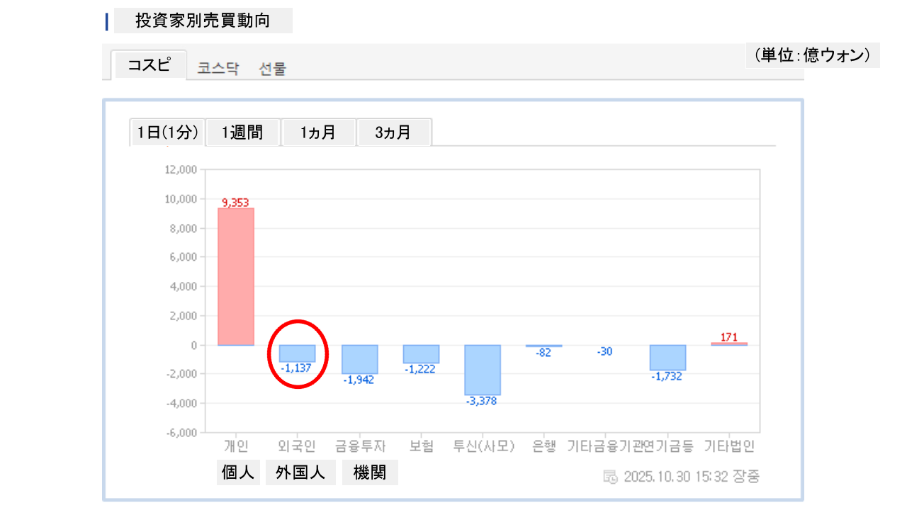 個人投資家は「9,353億ウォン」の買い越し。一方の外国人投資家は「1,137億ウォン」の売り越しです。