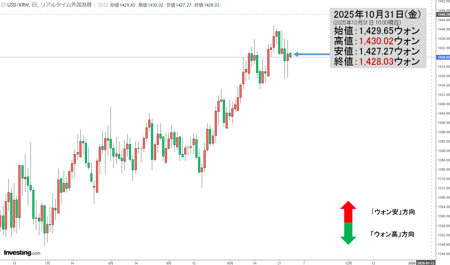 「ドルウォン」10月31日(金)初動・「1,428ウォン」上げ始まりで陰線。