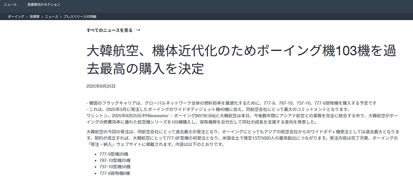 ワシントン、2025年08月25日/PRニュースワイヤー/― ボーイング[NYSE:BA]と『大韓航空』は本日、『大韓航空』が保有機の近代化と、今後数年間にわたりアシアナ航空との運航統合を完全に進めていく過程での成長を支援するため、ボーイングの燃料効率に優れた航空機ファミリー103機を購入する意向を発表した。