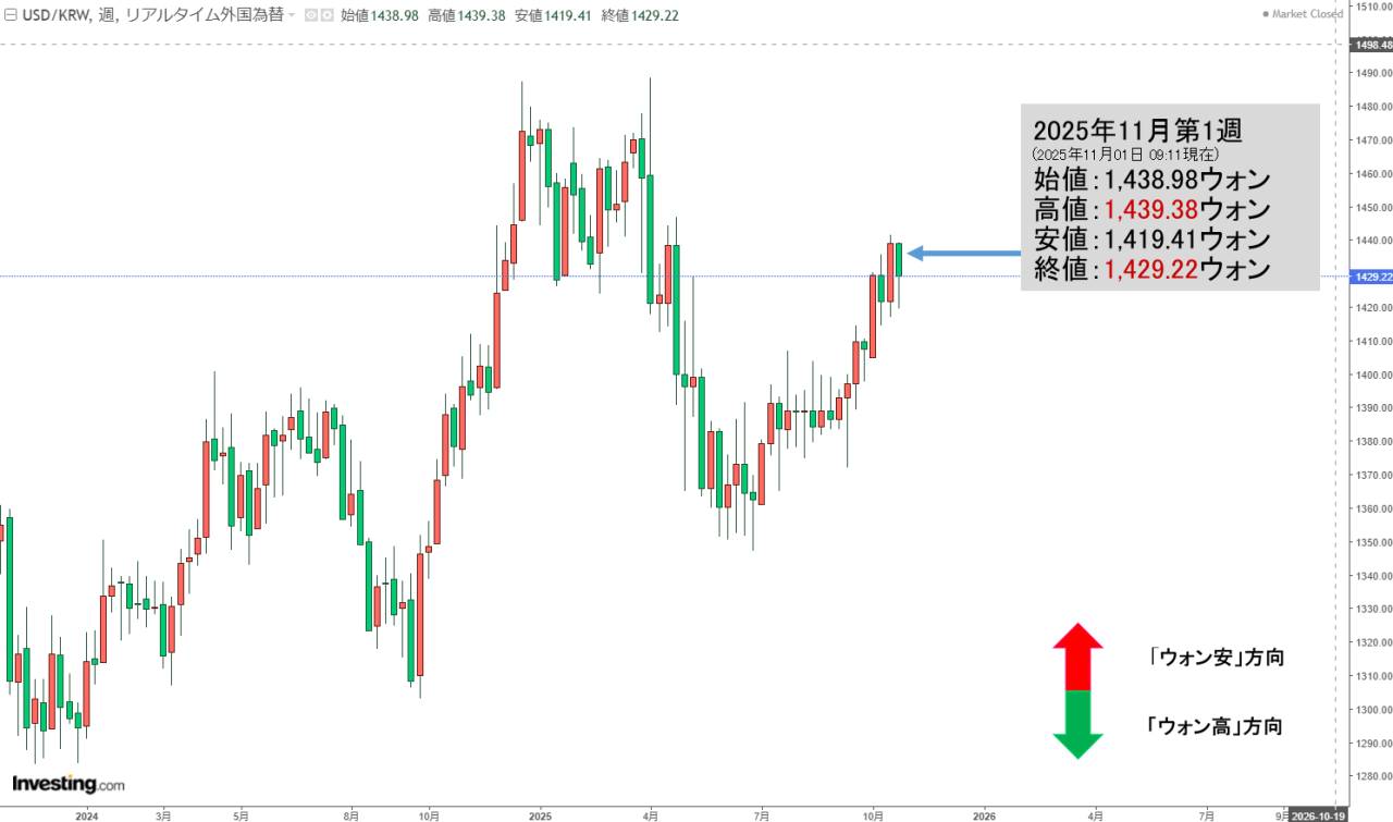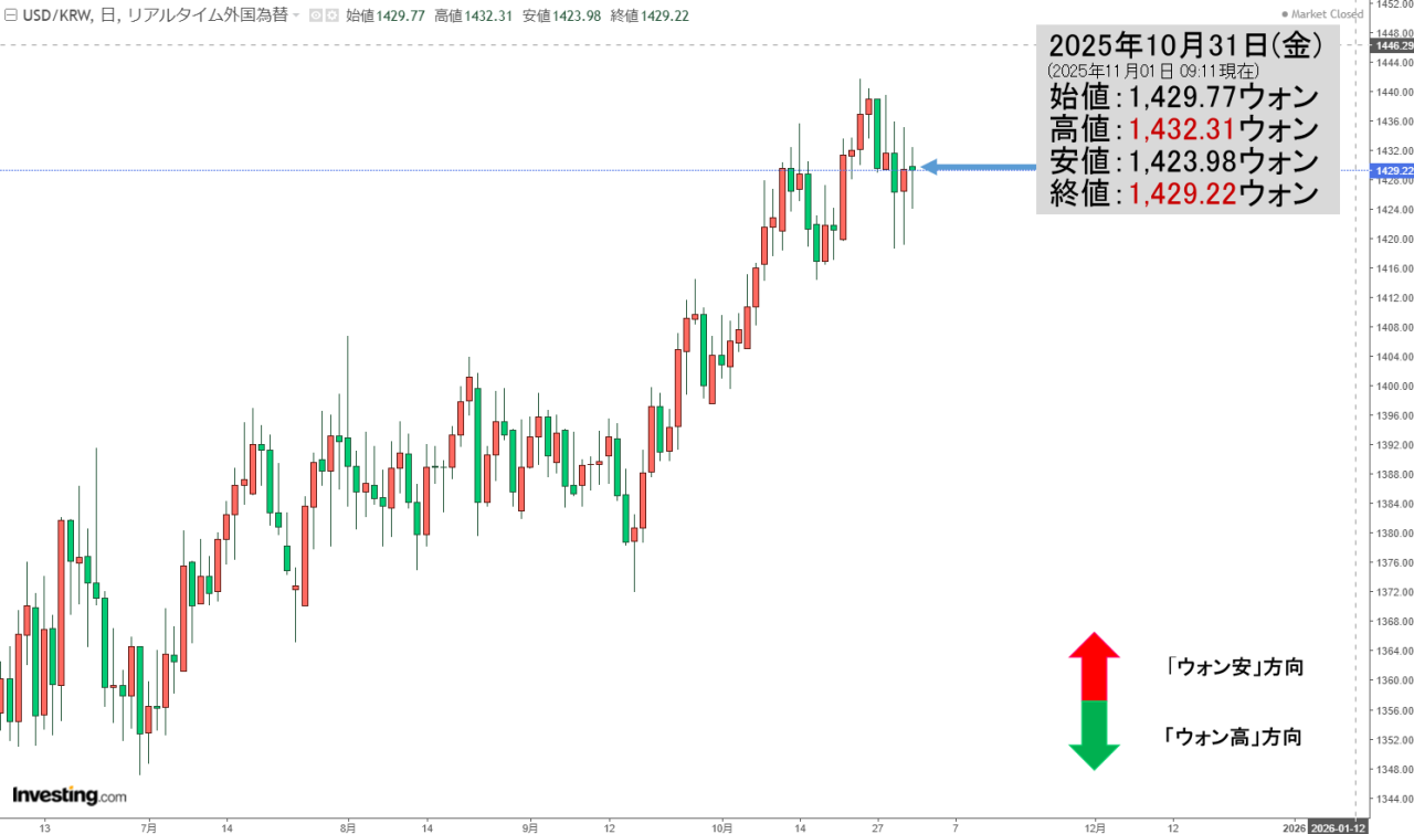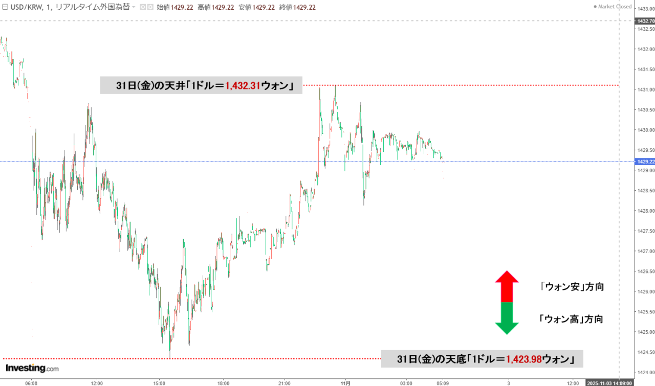 2025年11月03日(月)の市場が開きました。10:00現在、ドルウォンのチャートは以下のようになっています(チャートは『Investing.com』より引用)。現在のところ「1ドル=1,431ウォン」近辺の攻防となっています。ローソク足…