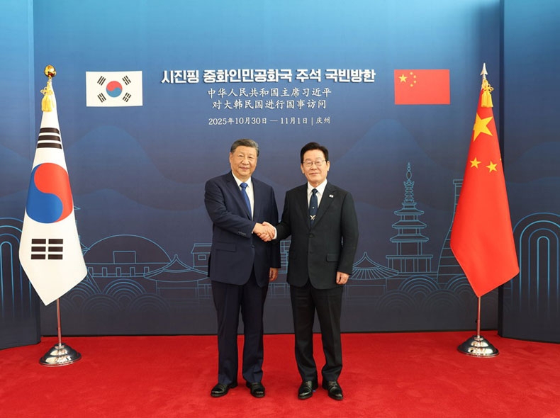李在明氏は習近平氏を熱烈に迎えた。両国首脳は握手を交わし、記念撮影を行った。