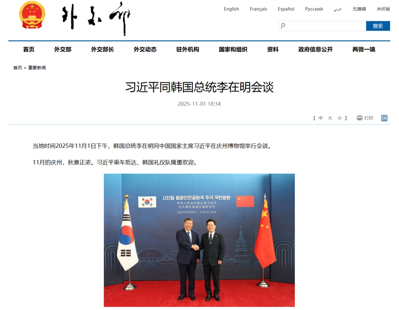 ⇒参照・引用元:『中国 外交部』公式サイト「习近平同韩国总统李在明会谈」