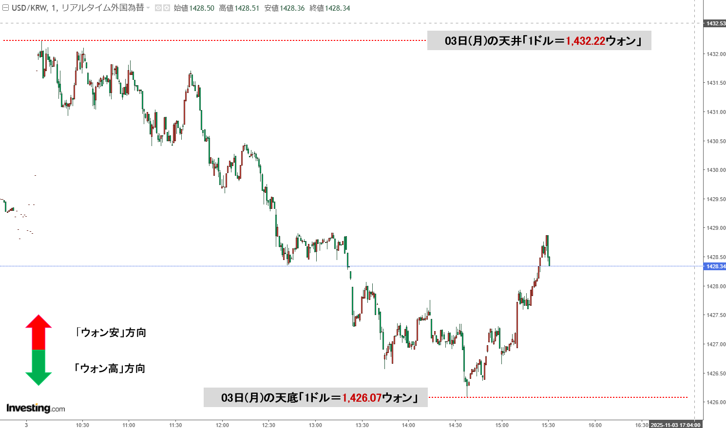 「ドルウォン」03日(月)夕刻・「1,428ウォン」コマ足化。