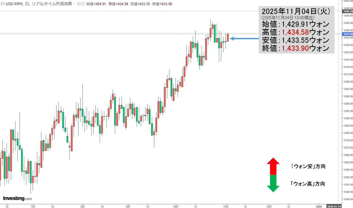 2025年11月04日(火)15:45現在、ドルウォンのチャートは以下のようになっています(チャートは『Investing.com』より引用)。陽線が伸びました。現在のところ「1ドル=1,438ウォン」で1,440のキリ番を巡る戦いとなって...