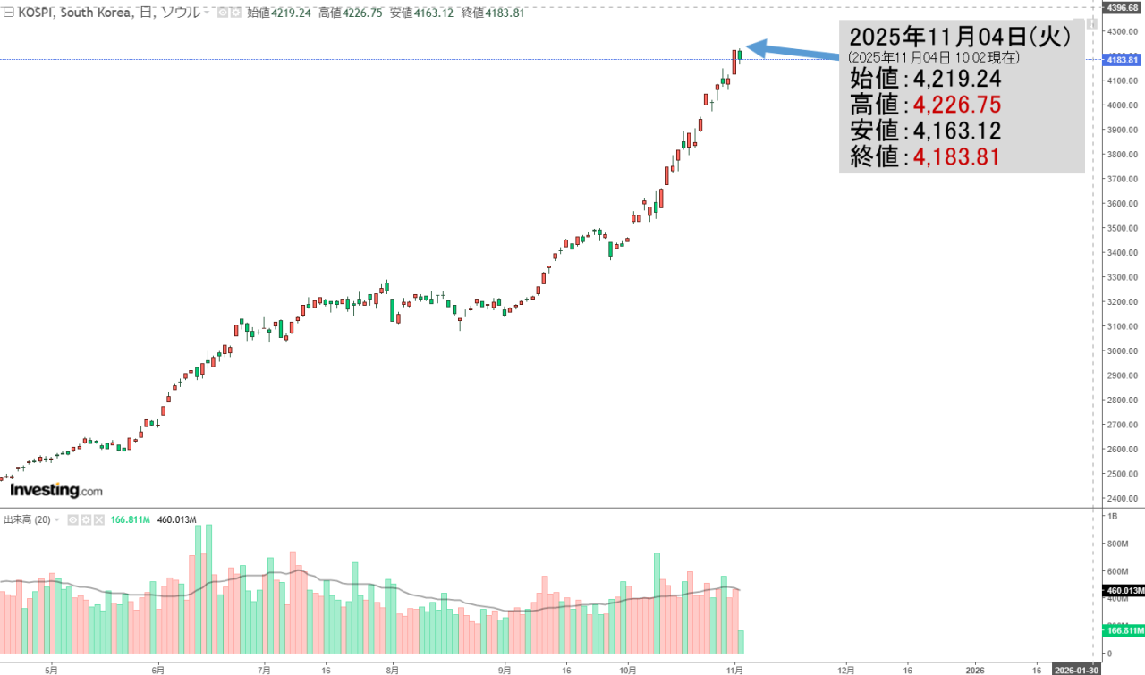 「韓国株式市場」11月04日(火)初動・KOSPI「4,183」個人投資家は1.2兆の買い越し。