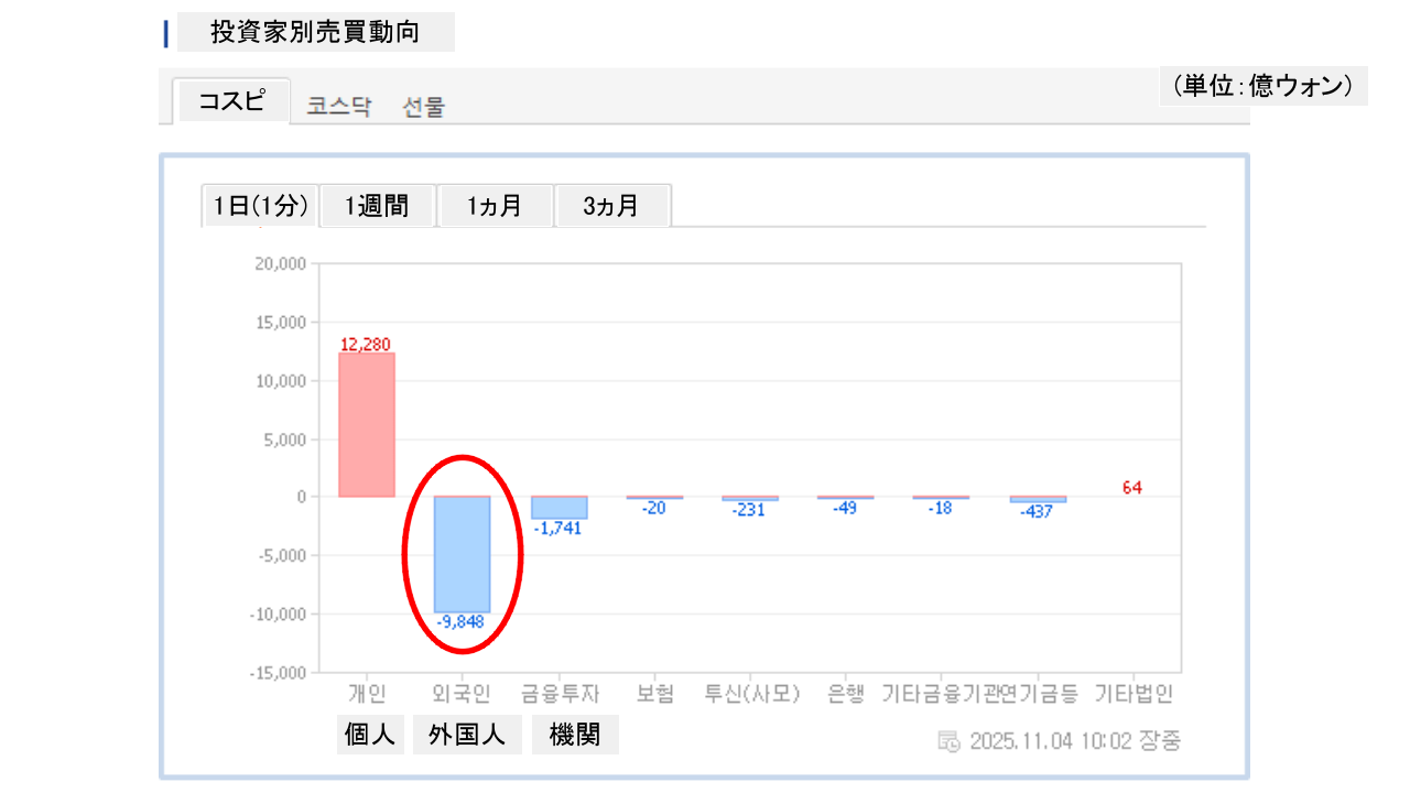 2025年11月04日(火)の韓国株式市場が締まりました。15:36現在、KOSPI(韓国総合株価指数)のチャートは以下のようになっています(チャートは『Investing.com』より引用)。投資家別売買動向は以下です。⇒データ引用元:『…