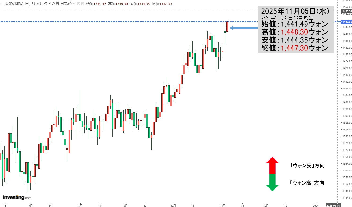 2025年11月05日(水)15:30現在、ドルウォンのチャートは以下のようになっています(チャートは『Investing.com』より引用)。ローソク足の調整が入って、風景が変わりました(笑)。現在のところ「1ドル=1,448ウォン」近辺...