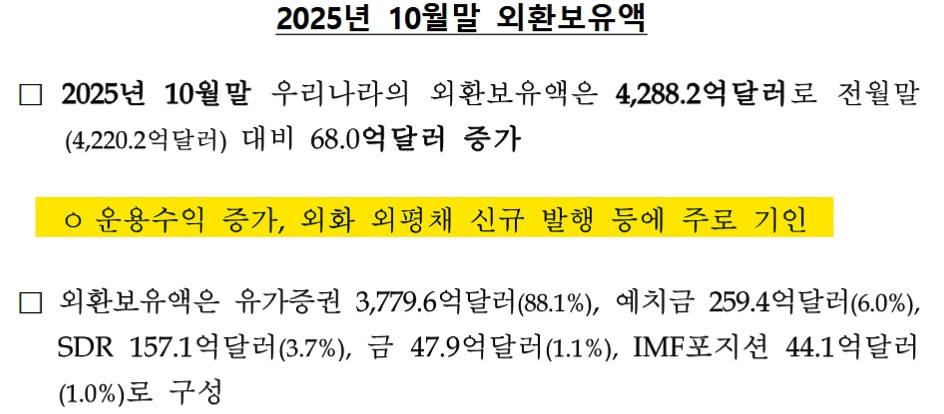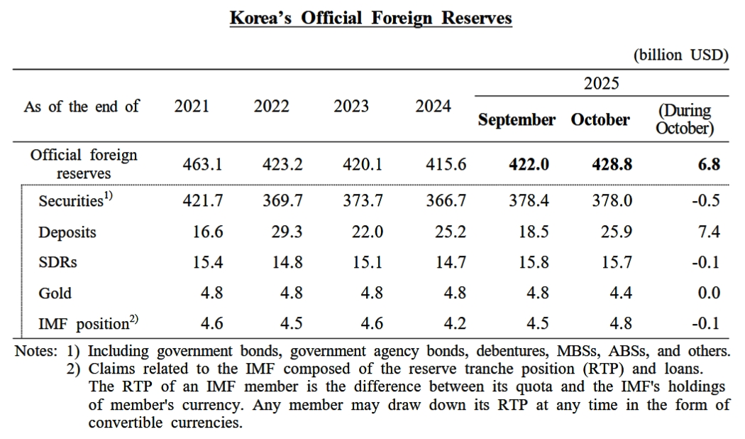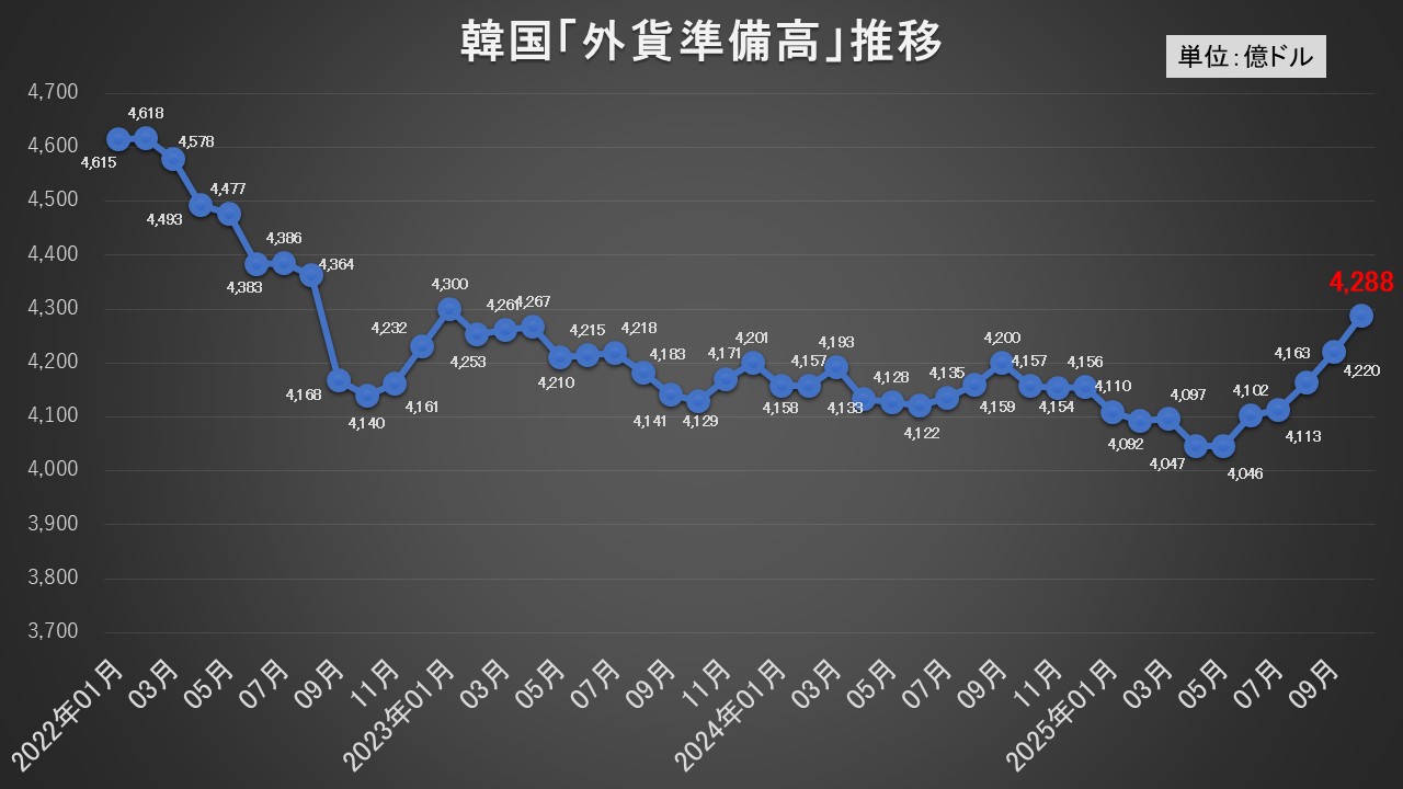 2025年11月05日、『韓国銀行』が2025年10月末時点での外貨準備を公表しました。