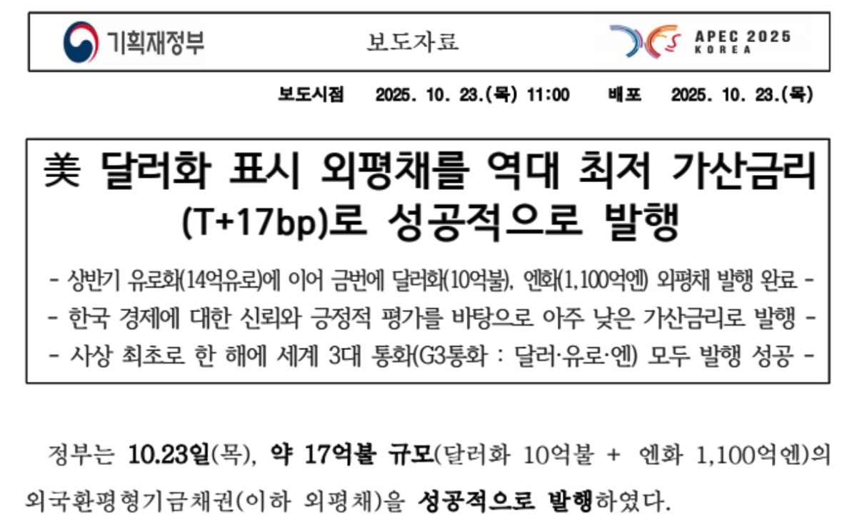 ↑2025年10月23日に韓国の企画財政部が出した「外平債発行」のプレスリリース。「2025年5月の追加補正予算で外貨建て発行枠を12億 ⇒ 35億ドルに拡大した国会決議を受けた対応」と書いています。2025年は年間34億ドルの外平債を発行する予定で、これはアジア通貨危機翌年の1998年「年間40億ドル」に継ぐ規模です。
