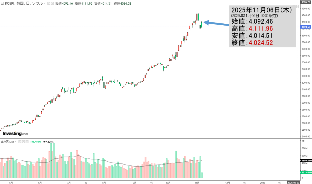 2025年11月06日(木)の韓国株式市場が締まりました。15:32現在、KOSPI(韓国総合株価指数)のチャートは以下のようになっています(チャートは『Investing.com』より引用)。下げました。前日終値よりは上なので「本日はアゲ...