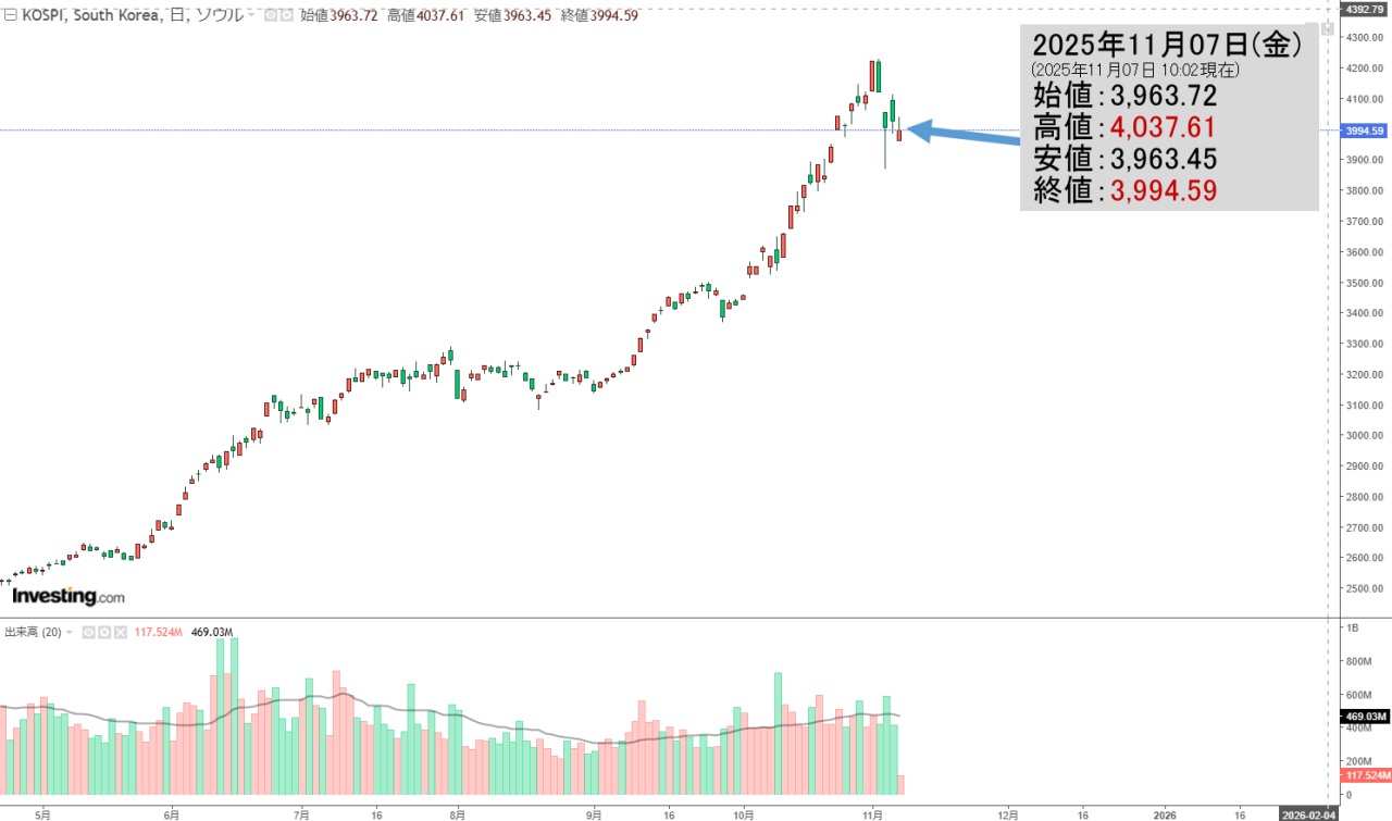 2025年11月07日(金)の韓国株式市場が開きました。10:02現在、KOSPI(韓国総合株価指数)のチャートは以下のようになっています(チャートは『Investing.com』より引用)。