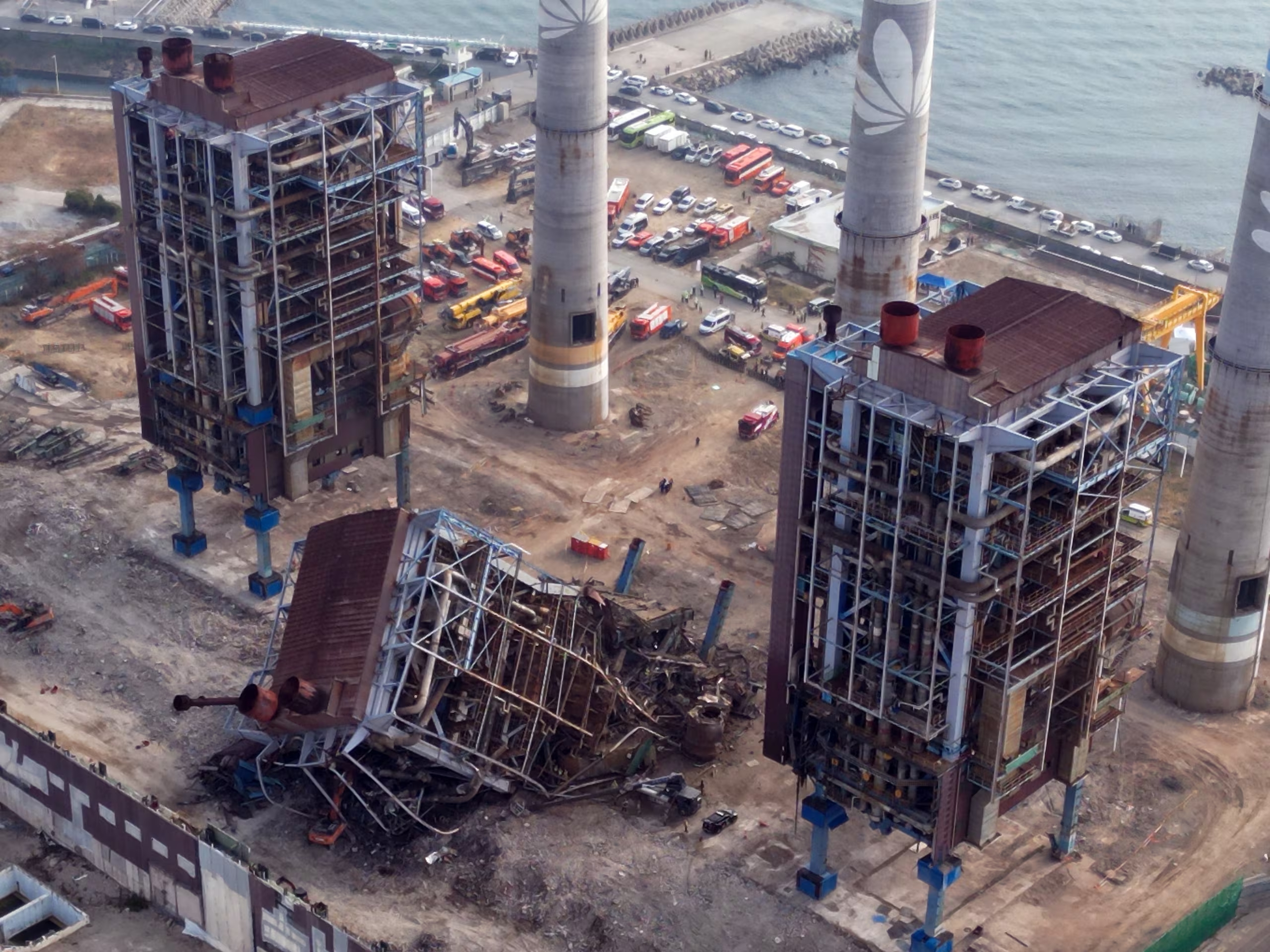 この蔚山火力発電所は、2022年に稼働を停止した、いわば「廃発電所」です(1981年に竣工)。解体・撤去工事が進められていた中で、5号機のボイラー棟が崩壊しました。