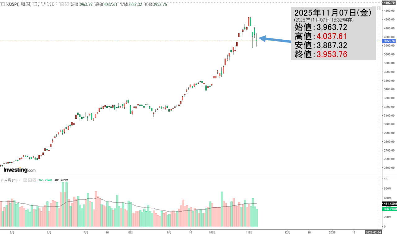 2025年11月07日(金)の韓国株式市場が締まりました。15:32現在、KOSPI(韓国総合株価指数)のチャートは以下のようになっています(チャートは『Investing.com』より引用)。