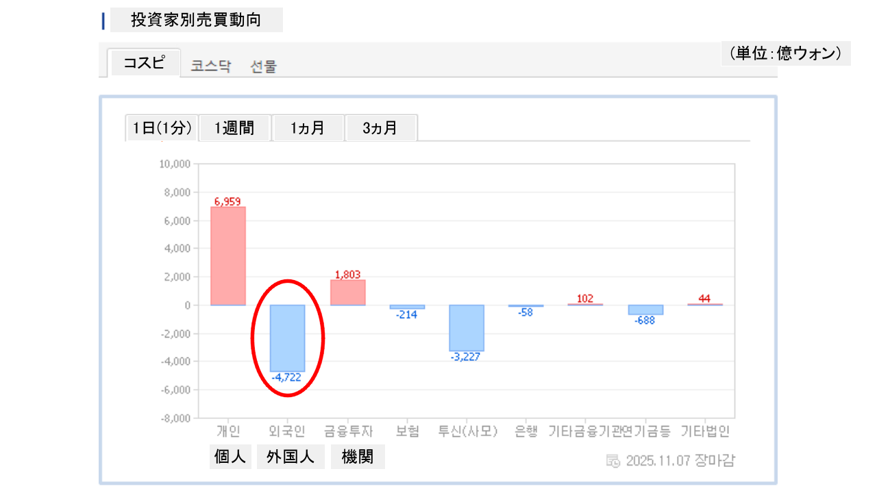 個人投資家は「6,959億ウォン」の買い越し。一方の外国人投資家は「4,722億ウォン」の売り越しです。