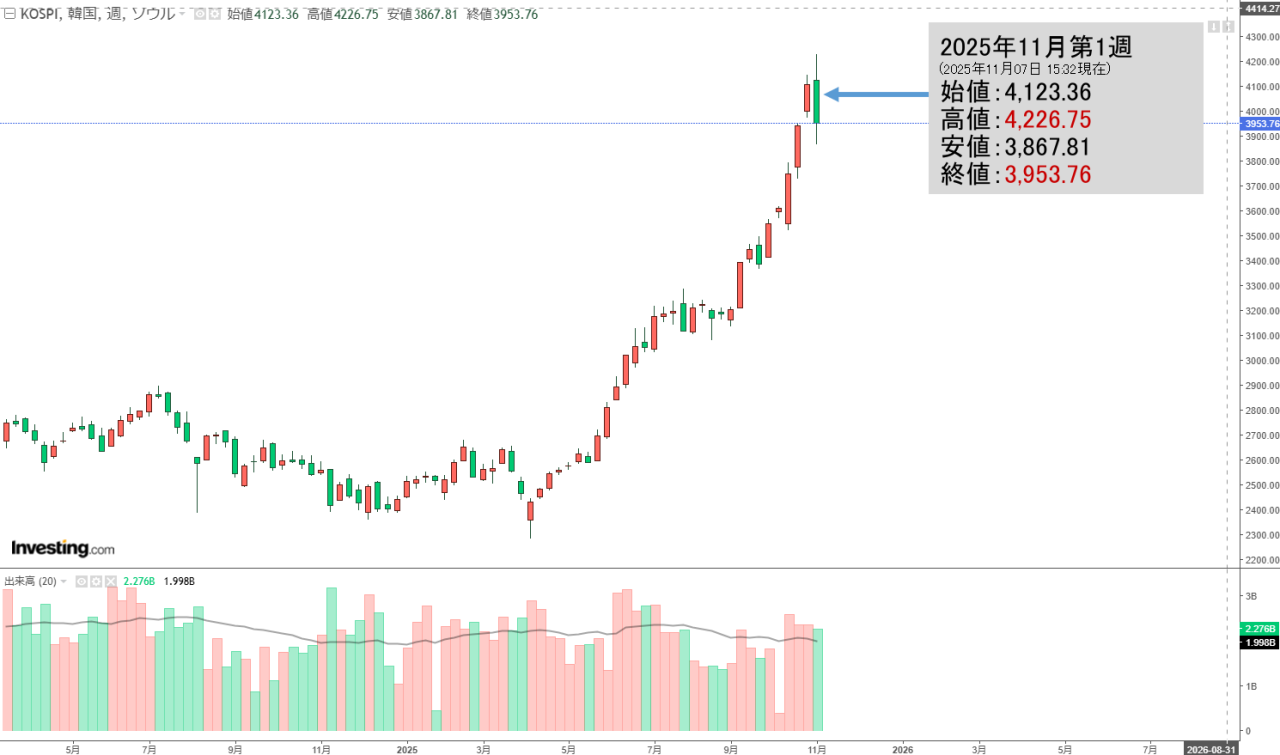 2025年11月10日(月)の韓国株式市場が開きましたので、KOSPIチャートの初動状況を以下の記事にまとめました。本記事と併せてお読み頂ければ幸いです。