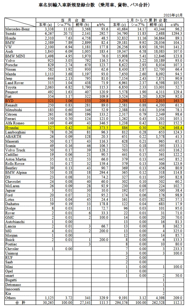 2025年11月07日、『日本自動車輸入組合』が10月の「輸入車新規登録台数(速報)」を公開しました。