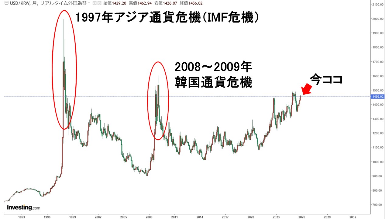 そもそも「マジノ線」とか言うから抜かれるんじゃないのか――なのですが、現在のドルウォンは以下のようになっています(チャートは『Investing.com』より引用:以下同)。