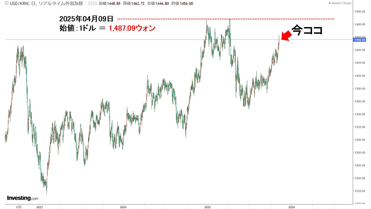 2025年11月07日(金)の終値が「1ドル=1,456ウォン」ですから、あと31ウォンです。