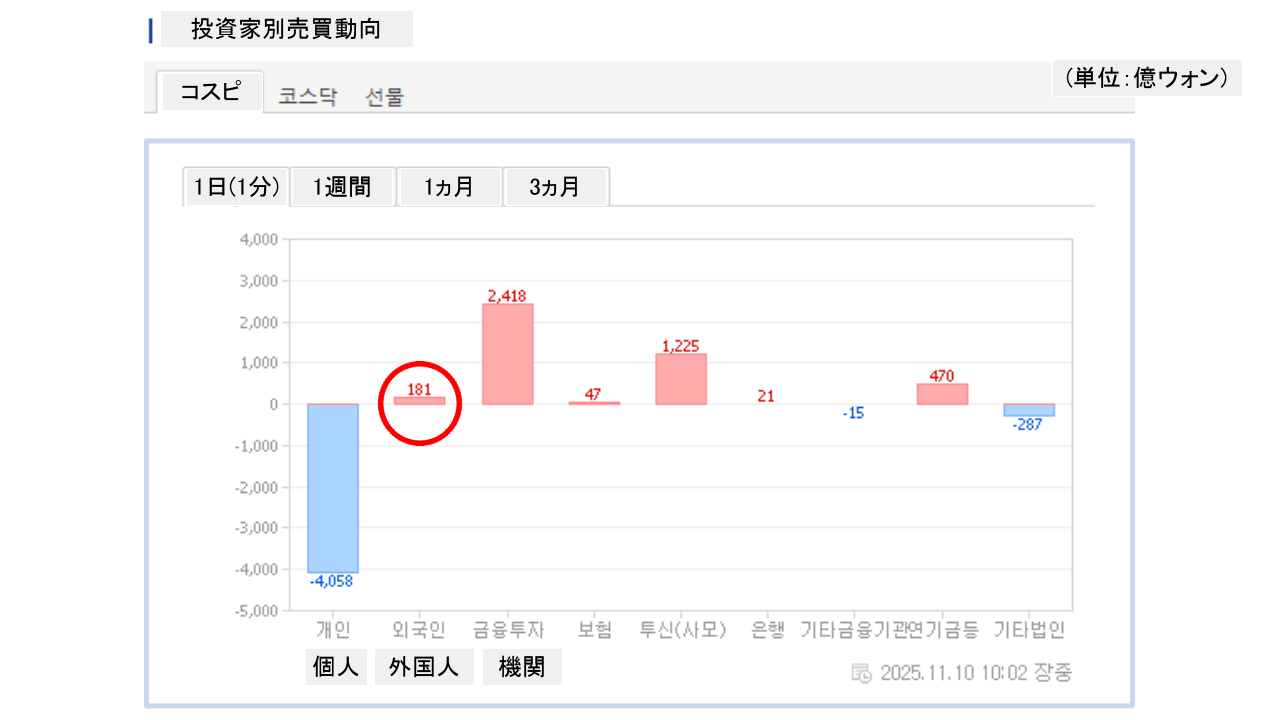 個人投資家は「4,058億ウォン」の売り越し。一方の外国人投資家は「181億ウォン」の買い越しです。