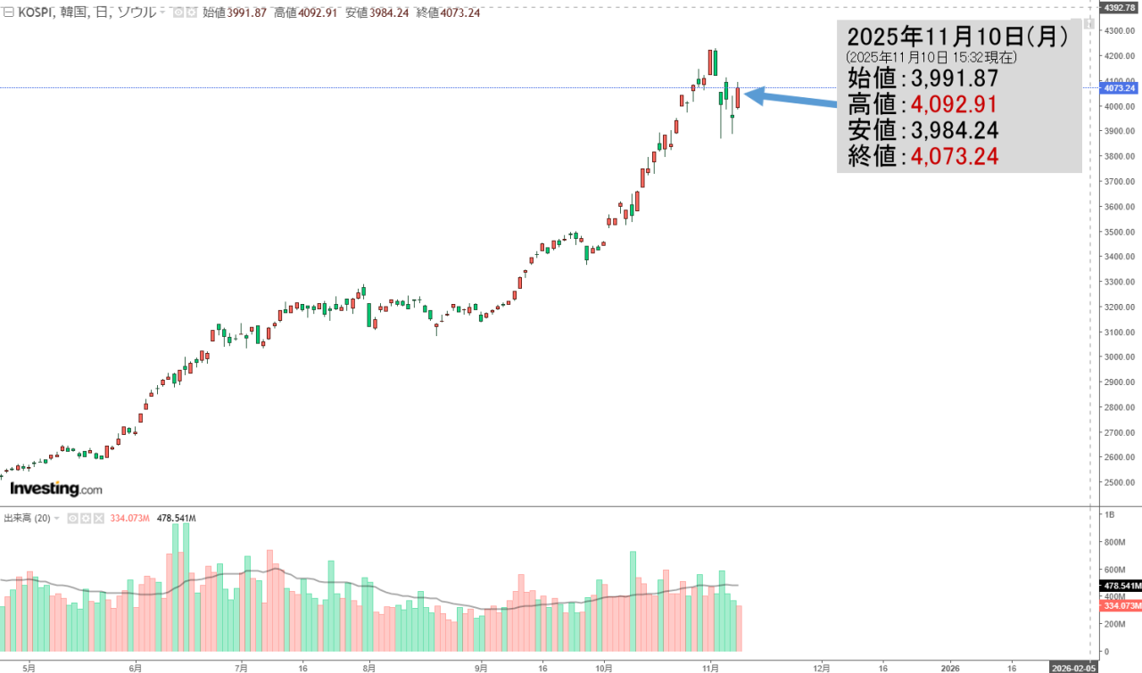 2025年11月10日(月)の韓国株式市場が締まりました。15:32現在、KOSPI(韓国総合株価指数)のチャートは以下のようになっています(チャートは『Investing.com』より引用)。
