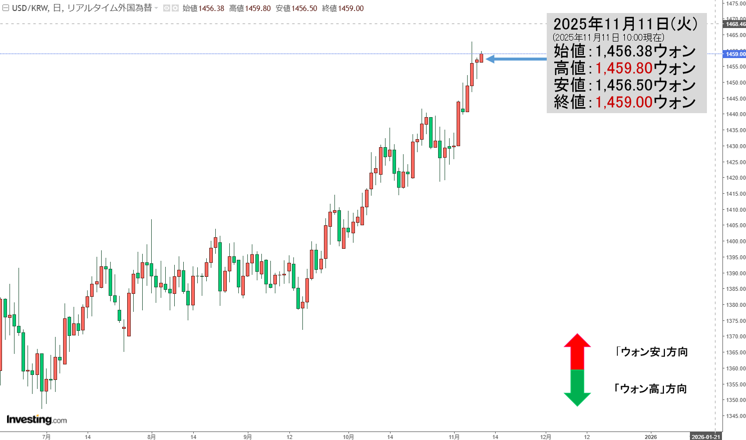 2025年11月11日(火)15:30現在、ドルウォンのチャートは以下のようになっています(チャートは『Investing.com』より引用)。「1ドル=1,460ウォン」を突破しました。ウォン安進行です。現在のところ「1ドル=1,463ウ...